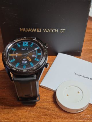 Reloj inteligente Huawei Watch GT con caja de 46mm en color negro. Incluye cargador y manual de inicio rápido. - Pantalla con indicadores de hora, fecha y nivel de batería. - Bisel con marcas de tiempo.