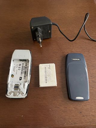 Teléfono móvil clásico Nokia 3310, un modelo icónico y muy resistente. Incluye cargador y batería. - Teléfono móvil Nokia 3310. - Cargador de pared. - Batería Nokia.