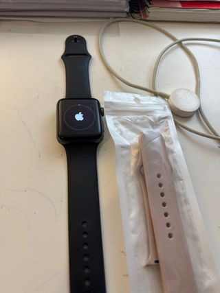 Apple Watch Series 3 en color negro, con una correa adicional en color rosa. + solo cable cargador. La corona (digital crown) funciona correctamente pero está un poco dura) ✅Tiene muy pequeñas rayas en los laterales (Segunda Foto)✅ No afecta a nada, y no se ven a la luz.✅ Funciona perfectamente y buena batería dura el día entero✅ ios, apple, manzana, regalo,