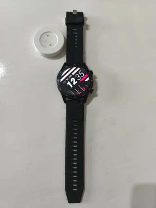 Reloj inteligente Huawei GT 2 con cargador. - Diseño elegante y moderno. - Correa negra de silicona. - Incluye cargador inalámbrico. Lee mensajes y WhatsApp, Puedes hacer llamadas y recibirlas pero no funciona el micro para hablar ( por eso el precio tan bajo),10 h de batería, En perfecto estado