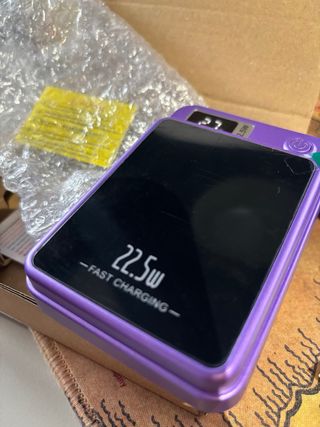 Preciosa batería externa inalámbrica de color morado. Es compacta y ligera, ideal para llevarla contigo a todas partes. - Carga rápida de 22.5w. - Compatible con iPhone. - Diseño elegante y portátil.