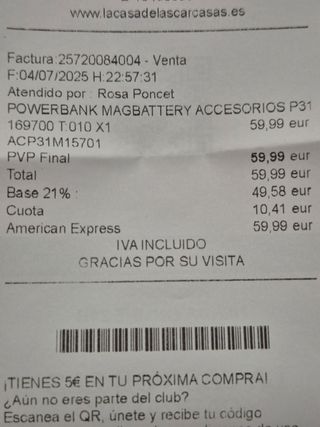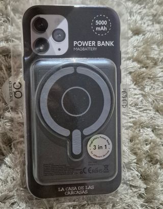 Vendo power bank MagBattery, cargador inalámbrico con batería de 5000 mAh. Comprado en julio, no tiene ni dos meses. Funciona perfectamente vendo por no usar. - Compatible con iWatch, con la tecnología TWS, con los teléfonos móviles de la serie 12 de Apple o superiores, y con todos los teléfonos móviles que admitan cargan inalambrica. (Por ejemplo, el mio es Samsung Galaxy) - Me costó 59,99 (adjunto ticket) y vendo por 40. - Batería de 5000 mAh. - Diseño compacto y ligero.