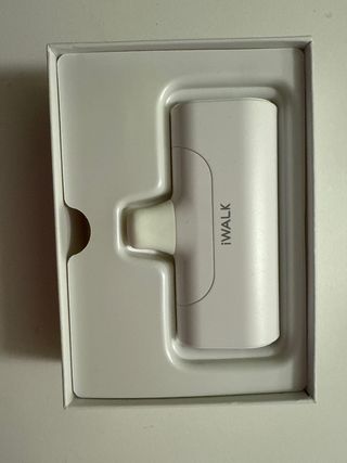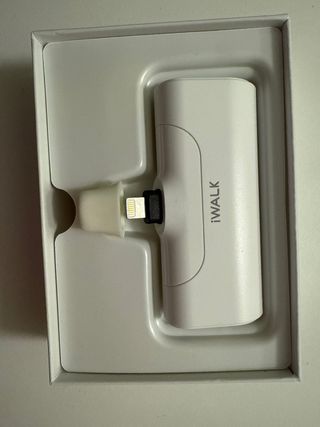 Se vende batería portátil iWALK para iPhone. Es un cargador antiguo, de color blanco y diseño compacto. - Perfecto para cargar tu iPhone sobre la marcha. - Diseño elegante y ligero.