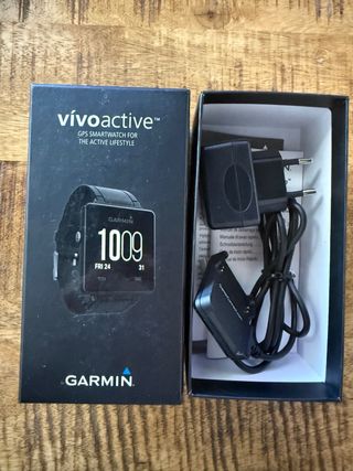 Atención CORREA ROTA Reloj inteligente Garmin VivoActive en color negro, diseñado para un estilo de vida activo. - Incluye cargador y cable de conexión. - Caja original del producto.