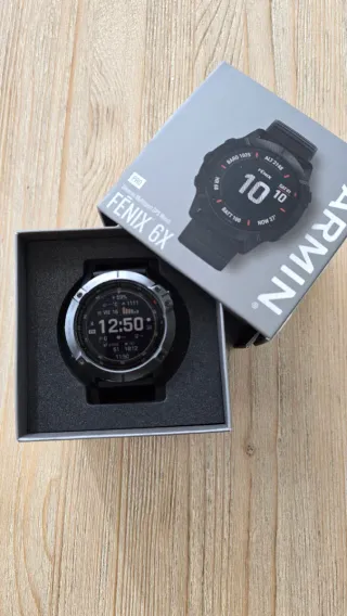 Reloj deportivo Garmin Fenix 6X Pro en muy buen estado y con poco uso. Con caja, instrucciones, correa original y muchos accesorios (10 correas extras, cargadores y protector de pantalla). Pantalla impoluta porque siempre ha usado protectores (incluyo uno sin poner).