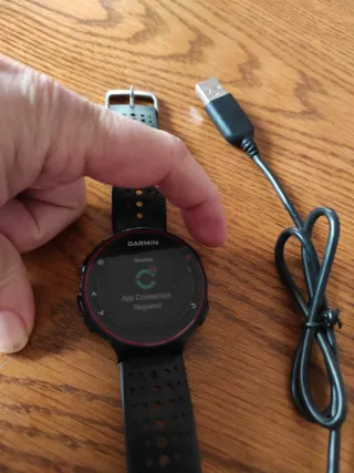 Reloj deportivo Garmin en color negro, ideal para actividades al aire libre. Apenas usado. Incluye su cargador. - Diseño deportivo y funcional. - Carga mediante conexión USB. - Falta la correa.