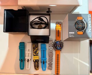 Reloj inteligente Garmin Epix Gen 2 con acabado zafiro. Incluye correas intercambiables. - Caja original. - Correa de silicona amarilla. - Correa de silicona gris. - Correa de titanio original garmin con sus eslabones. -Cargador
