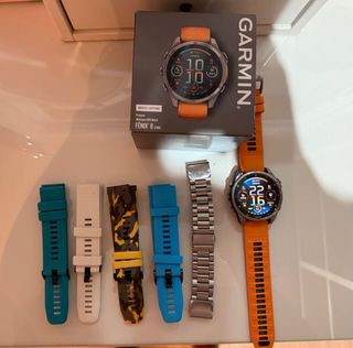 Reloj inteligente Garmin Fenix 8 impecable. Incluye varios correas y su caja original, cargador y certificado de compra Garmin con número de serie. Regalo: - Correa de silicona naranja incluida en la caja. - Correa de silicona azul. - Correa de silicona blanca. - Correa de silicona turquesa. - Correa de silicona roja (No está en la foto) - Correa de camuflaje con detalles amarillos. - Correa de metal plateada para vestir. - Cable de carga.