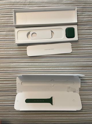 • Modelo: Apple Watch Series 7 • Tamaño: 45 mm • Conectividad: GPS • Color: Verde • Correa: Original deportiva verde (dos tallas S/M y M/L incluidas) • Accesorios: Caja original, documentación y cable cargador magnético USB-C • Estado físico: pantalla con algún rasguño pequeño del uso diario, caja y accesorios en muy buen estado y correa en buen estado, sin signos de desgaste visibles. • Comentarios: precio original 450€, se dispone de ticket de compra escaneado, las cajas son las originales porque me gusta guardarlas, batería en buen estado 85%. Se vende por compra de Garmin Forerunner :)