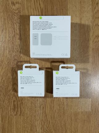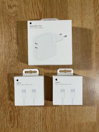 El adaptador de corriente con dos puertos USB-C de 35W original de Apple te permite cargar dos dispositivos a la vez. Compatible con MacBook Air, el iPhone, el iPad, el Apple Watch y los AirPods. Pack incluye también DOS cables USBC a USBC 1 metro largos. Completamente NUEVOS en su cajas original sin ABRIR.