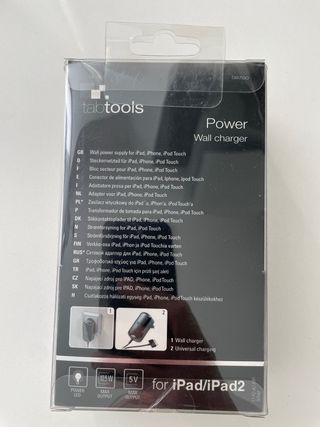 Cargador de pared Tabtools para iPad, iPhone y iPod. - Incluye adaptador de corriente y cable de carga. - Potencia de salida: 2.1A. - Voltaje de entrada: 230V. - Compatible con iPad/iPad2/ipod touch/2g-3g/ iphon3gs/3g/4