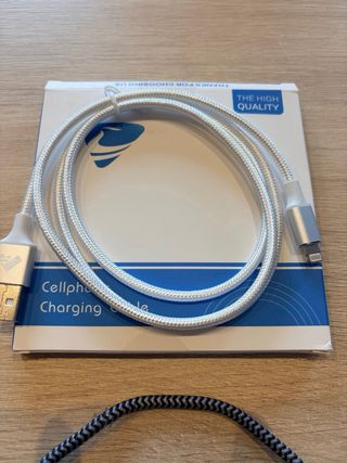 Lote de cuatro cables Lightning para iPhone. Son ideales para cargar y sincronizar tus dispositivos Apple. - Cable blanco trenzado. - Cable blanco trenzado con caja. - Cable gris y negro trenzado. - Cable gris y negro trenzado.