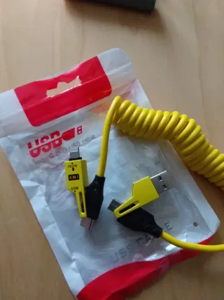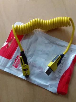 Cable de carga USB enrollado de alta calidad iphone, Samsung, poco,redmi,xiaomi - Conector USB-A a USB-C, Lightning y Micro USB. - Potencia máxima de 65W. - Diseño en espiral para mayor comodidad. - Color amarillo vibrante.