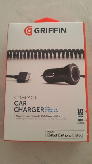 Cargador para coche, furgoneta, camión, autobús... compatible con Iphone 3, 3GS, 4, 4S, y primeras generaciones de Ipad y Ipod. Preguntar por compatibilidad. Funcionando al 100%. Fotos reales