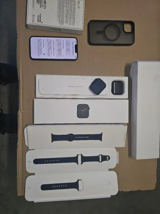 Se vende iPhone 13 junto con un Apple Watch Series 6 de 44mm. Incluye accesorios. - Funda para iPhone negra. - Cargador para Apple Watch. - Correa adicional para Apple Watch azul marino. Batería del iPhone en 84% Batería del Apple watch 79% Solo se entrega en persona