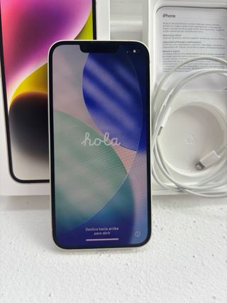 Teléfono móvil iPhone 14. Perfecto estado sin ningún rasguño con protector del MediaMark puesto. Funciona perfectamente con un 84% de salud de batería. Repito sin ningún defecto. - Color: oro, morado. - Incluye cargador y funda. - Pantalla de 6.1 pulgadas. - Cámara dual de 12 MP. - Chip A15 Bionic.