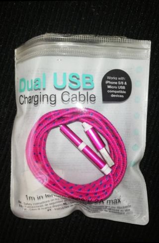 Cable de carga dual USB 1 metro de longitud, plano Multiextremo del cable de carga, universal (para la mayoría de los smartphone actuales) Conector doble: Funciona con IPhone 5/6 y dispositivos compatibles con USB EL CORDON ES DURADEO Y NO SE ENREDA 5A Max y 5V Éste producto se envía sólo fuera de wallapop. No acepta devolución