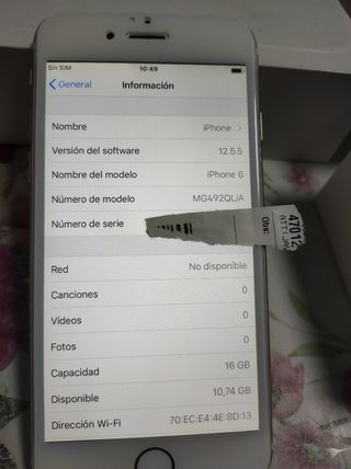Teléfono móvil iPhone 6s con versión de software 15.8.2. - Modelo: iPhone 6s - Número de modelo: MN0W2QL/A - Número de serie: FFNX2CVJHFLR - Cobertura caducada - Batería: Servicio - Red: No disponible sin cargador