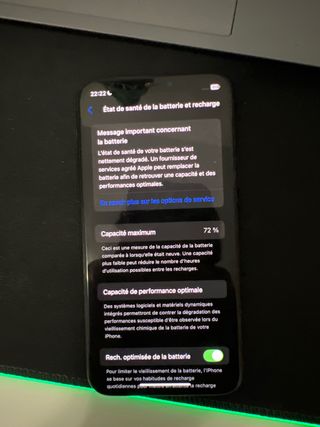 iPhone 11 Pro con un mensaje importante sobre la batería. - Capacidad máxima de la batería del 72%. - La salud de la batería se ha degradado. - La carga optimizada de la batería está activada. -tiene una problema en la cobertura (cuesta unos 30euros para areglar la) -con cargador original