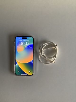 Teléfono móvil iPhone 14 Pro con acabado en negro y gris. - Capacidad de almacenamiento de 128 GB. - Incluye cargador USB-C de 20W. - Funda protectora transparente. Sin ningún desperfecto, batería al 77%. Se entrega también caja original y cargador original nuevo