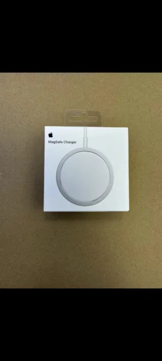 Cargador inalámbrico MagSafe original de Apple para iPhone. Se encuentra en estado nuevo, sin usar. - Diseño circular blanco. - Incluye cable USB-C.