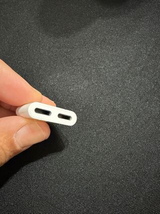 Adaptador para iPhone que permite cargar el dispositivo y conectar auriculares simultáneamente. Ideal para escuchar música mientras se carga. - Conector Lightning. - Puerto para auriculares. - Puerto de carga Lightning a usbc