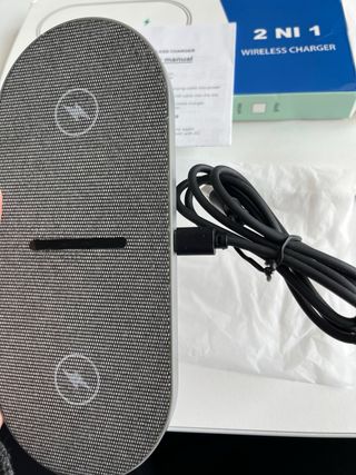 Almohadilla de carga inalámbrica Dual . Sirve para cargar 2 telefónos o Airpods. Con 2 luces que indican si se esta cargando o no el dispositivo. Una luz para cada zona de carga. Rojo no carga; Azul cargando. Compatible según fabricante para iPhone, Airpods 3 Pro, 15, 14, 13, 12, 11, XS, XR, X, 8, Samsung S23, S22, S21, 15W+15W Probado con Iphone carga perfectamente.