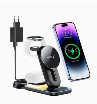 Cargador Inalámbrico AGPTEK 4 en 1, Carga Magnética para iPhone 12/13/14, Carga Inalámbrica para iPhone 8/X/XR/11 y Android Qi, para AirPods/Galaxy Buds, para Apple Watch, con 18W Adaptador y Luz LED. Luz nocturna y luz táctil ajustable, Adaptador de 18 W incluido, Mag-Safe (magnético). Hecho de aleación de aluminio de alta calidad. Precio mercado 42,99€ NUEVO precintado.