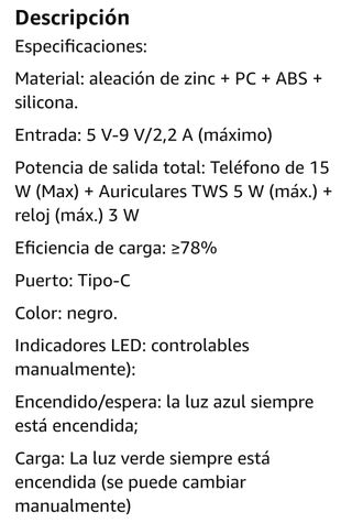 Cargador inalámbrico 3 en 1 Neekfox. 15W. Cargador multifunción que te ayuda a cargar 3 dispositivos a la vez: móvil, SmartWatch y auriculares tanto Apple como Android siempre que dispongan de carga inalámbrica. Con temporizador de sueño y dimmer de tres niveles y función de despertador. Incluye accesorio para cargar iPhone mini, adaptador de 18W QC 3.0, cable tipo C y manual. Ajustable en ángulo y plegable. Tipo de conector USB. NUEVO a estrenar en caja.