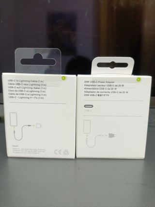 Se vende cargador Apple USB-C de 20W junto con un cable USB-C a Lightning de 1 metro. - Adaptador de corriente USB-C de 20W. - Cable USB-C a Lightning de 1 metro.