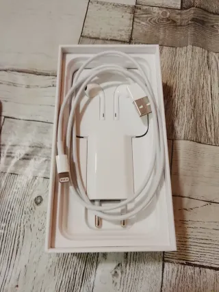 Cargador original de Apple para iPhone. Incluye adaptador de corriente y cable. - Adaptador de corriente blanco. - Cable blanco con conector USB. - Palito par sacar la tarjeta