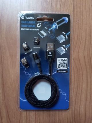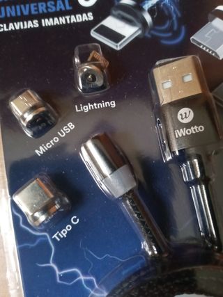 Cable de carga universal Iwotto. Dispone de 3 conectores imantados de fácil colocación (micro Usb, tipo C y Iphone) Longitud de 1 metro. Iluminación azul mientras está enchufado. Recubrimiento de tela y conectores de aluminio. Es cable de carga, No de datos. Nuevo. Esta precintado.