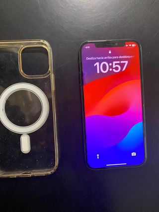 Teléfono móvil iPhone 12 con 128GB de almacenamiento. - Color negro. - Pantalla de 6.1 pulgadas. -Regalo funda magsafe original En las fotos se ven claramente los desperfectos estéticos en el marco. La pantalla y cámaras están perfectos. No incluye cargador (se rompió con los años). SOLO ACEPTO DINERO!!