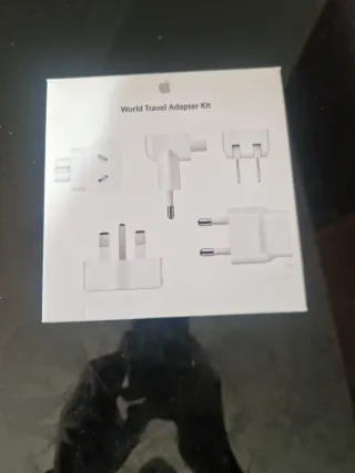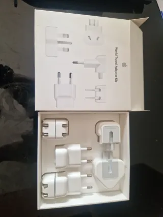 Kit original de adaptadores de viaje de la marca Apple. Nuevo en su caja. "World Travel Adapter Kit" Está diseñado para el iPod, iPhone y iPad, y es compatible con los Adaptadores de corriente MagSafe y MagSafe 2 de Apple (para el MacBook, MacBook Pro y MacBook Air) Incluye varios tipos de enchufes para varios paises: Norteamérica, Japón, China, Reino Unido, Europa continental, Corea, Australia, Hong Kong y Brasil.