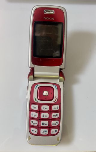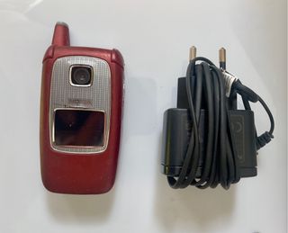 Teléfono móvil Nokia 6103 en color rojo y plateado. - Diseño plegable. - Cámara integrada. - Cargador incluido.