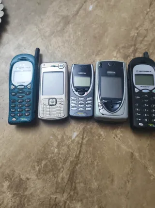 Conjunto de cinco teléfonos móviles antiguos, perfectos para coleccionistas o para quienes buscan un estilo retro. Incluye modelos de las marcas LG y Nokia. - Un teléfono LG plateado. - Un teléfono Nokia negro. - Tres teléfonos adicionales plateados. Desconozco si funcionan o les pasa algo sin cargador