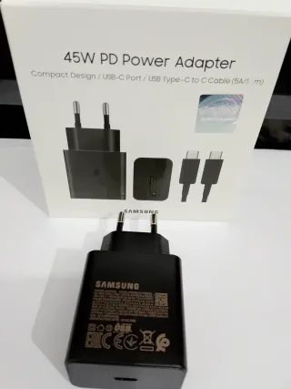 Precio habitual: 15 euros. Nuevo a estrenar. Tanto el cargador como el cable son usb tipo C. Cargador ultrarápido 2.0 de 45W. Modelo cargador Samsung EP-TA845. Modelo cable EP-DG977.