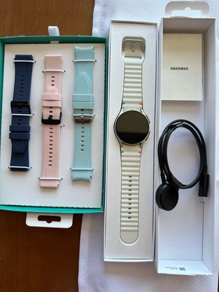 Reloj inteligente Samsung Watch 7 con correas intercambiables. - Correa principal de color blanco. - Incluye correas adicionales en color azul claro, azul oscuro y rosa. - Cargador inalámbrico (sin uso) Fue un regalo y nunca se ha usado no es compatible con iphone solo para android