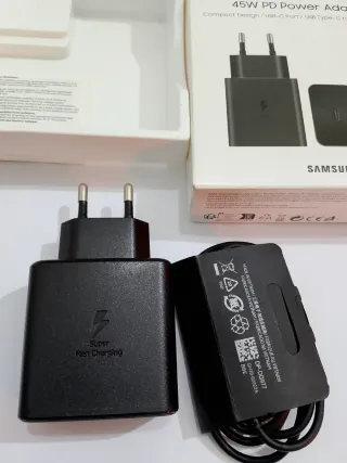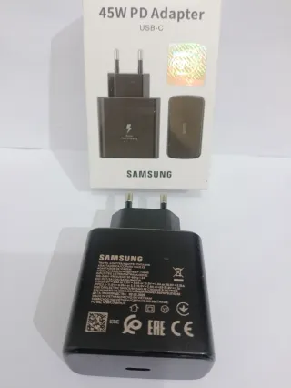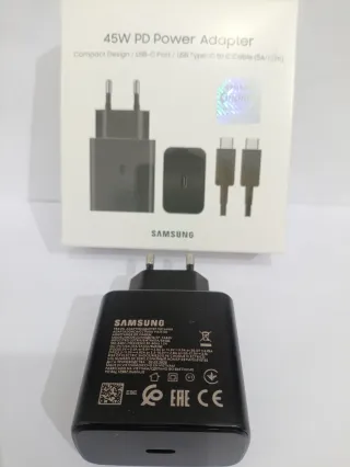 Cargador Samsung 45w Adaptador de corriente Samsung de 45W con tecnología PD (Power Delivery). - Incluye cable USB-C a USB-C de 1 metro (5A). - Diseño compacto. - Carga rapida
