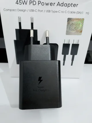 Adaptador de corriente Samsung de 45W con tecnología PD (Power Delivery). Incluye cable USB Type-C a Type-C de 1 metro. - Diseño compacto. - Carga rapida - Puerto USB-C. - Cable de 5A/1m.