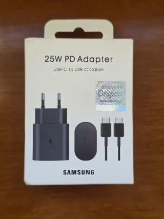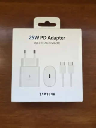 Adaptador de corriente Samsung de 25W de color blanco, en su caja sellado sin abrir. Perfecto para regalar en Navidad y Reyes. - Incluye cable USB-C a USB-C. - Carga rápida para dispositivos compatibles