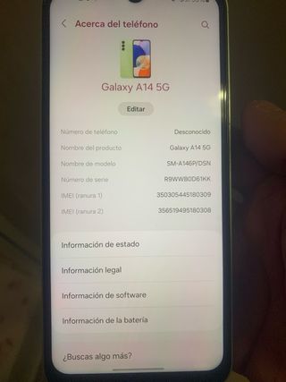 Teléfono móvil Samsung A14 5G en perfecto estado, casi sin uso. - Capacidad de almacenamiento de 128 GB. - Conectividad 5G. - Color verde vibrante. - cable cargador incluido - caja original incluida Regalo funda No hago envíos. venta en mano zona Alcalá de Henares o cercanía.