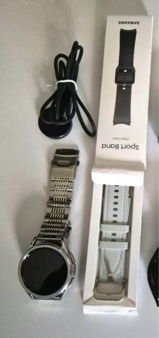 Reloj inteligente Samsung Galaxy Watch 6 Classic en color plateado. Incluye correa blanca. - Correa de repuesto de color blanco. - Cargador inalámbrico. Samsung Galaxy Watch 6 Classic prácticamente nuevos a estrenar . no sé han usado ni 15 días .(le restan más de 2 años de garantía aún) Las correas originales nunca se han usado . También se regalan las correas plateadas que son las que se usaron. no tienen caja porque se tiró,solo está la caja de las correas ORIGINALES a estrenar .