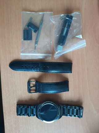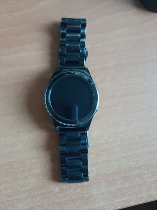 Reloj smartwach Samsung S2 con correa intercambiable. El reloj funciona perfectamente, la pantalla sin rozaduras ni arañazos. Entrego correa original de cuero y metálica con accesorio para cambio. Ambas correas presentan desgaste del uso. Se entrega cargador original también. El cable funciona, pero hay que inclinarlo algo para que haga contacto. Lo vendo porque me han regalado uno nuevo.