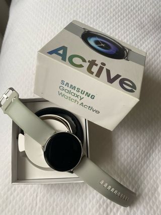 Samsung Galaxy Watch Active en color gris/plateado. Características: • Pantalla Super AMOLED de 1,1” • Compatible con Android • Seguimiento deportivo y de salud (frecuencia cardíaca, pasos, etc.) • Diseño ligero y cómodo para uso diario o deportivo Incluye: • Reloj Samsung Galaxy Watch Active • Cargador original • Caja original Estado: buen estado