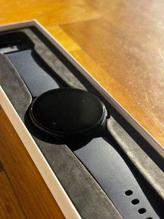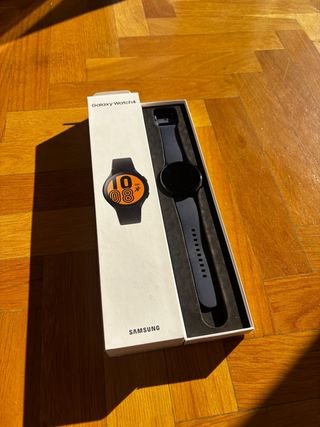 Reloj inteligente Samsung Galaxy Watch 4 en color negro. Incluye tres correas adicionales para personalizar. En muy buen estado y funcionando perfectamente. Tiene un leve roce (visible en una de las fotos), puramente estético, no afecta en absoluto a su funcionamiento. Incluye: • Reloj Samsung Galaxy Watch 4 • Caja original • Cargador original • 3 correas: negra (original), azul marino y blanca Características destacadas: • Pantalla AMOLED • Wear OS (apps, notificaciones, llamadas) • Medición de frecuencia cardíaca, oxígeno