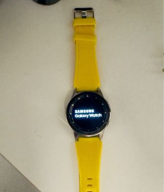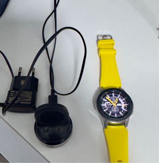 Reloj inteligente Samsung Galaxy Watch con correa intercambiable. Tengo la original y varios colores . - Color de la caja: plateado. - Color de la correa: amarillo. - Incluye cargador.