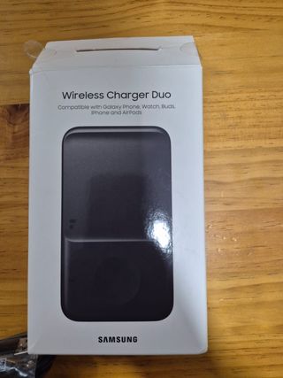 Cargador inalámbrico doble de Samsung, modelo Wireless Charger Duo. Carga rápida. Viene en su empaque original. - Diseño elegante en color negro. - Compatible con teléfonos, relojes y auriculaes Galaxy Phone, Watch, Buds, Iphone y Airpods. - Incluye cable de carga.