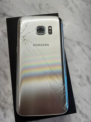 Teléfono Samsung Galaxy S7 en color negro y plata. Tiene algunas marcas de uso y la parte trasera está un poco rallada - funciona perfectamente,no incluye cargador usa el cargador universal