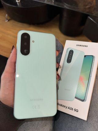 Teléfono móvil Samsung A26 5G en color verde. - Incluye cargador y cable USB. - Funda protectora transparente. Ningún arañazo con garantía mediamark y factura..